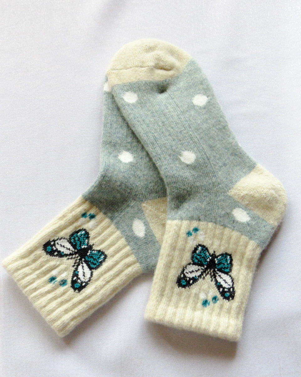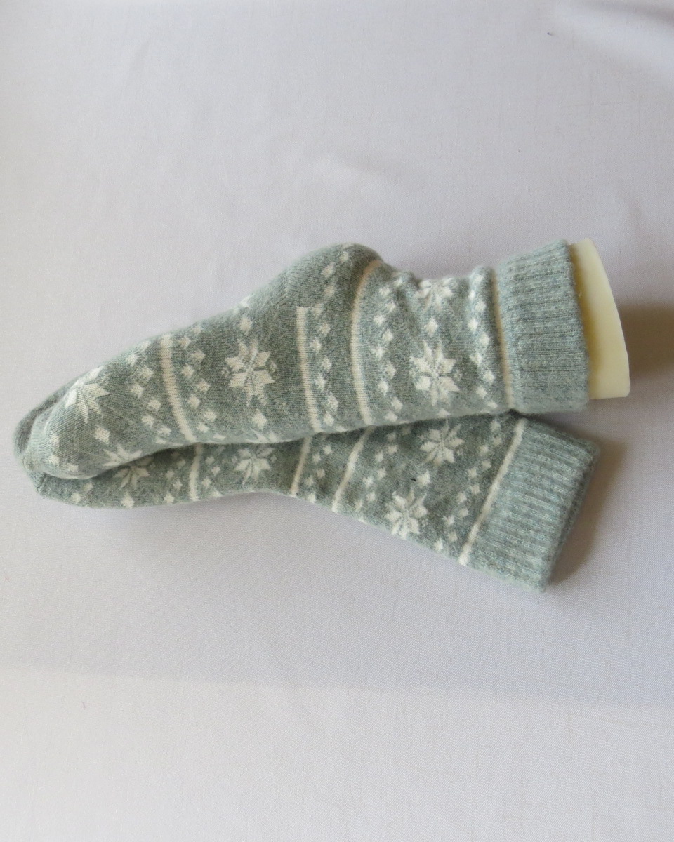 | Choix | Rose avec flocon de neige, Vert pastel avec flocon de neige, Vert pastel avec papillon, Gris clair avec semelle et talon en blanches, Gris clair avec un renne et des motifs sur la cheville, Gris avec des rennes |