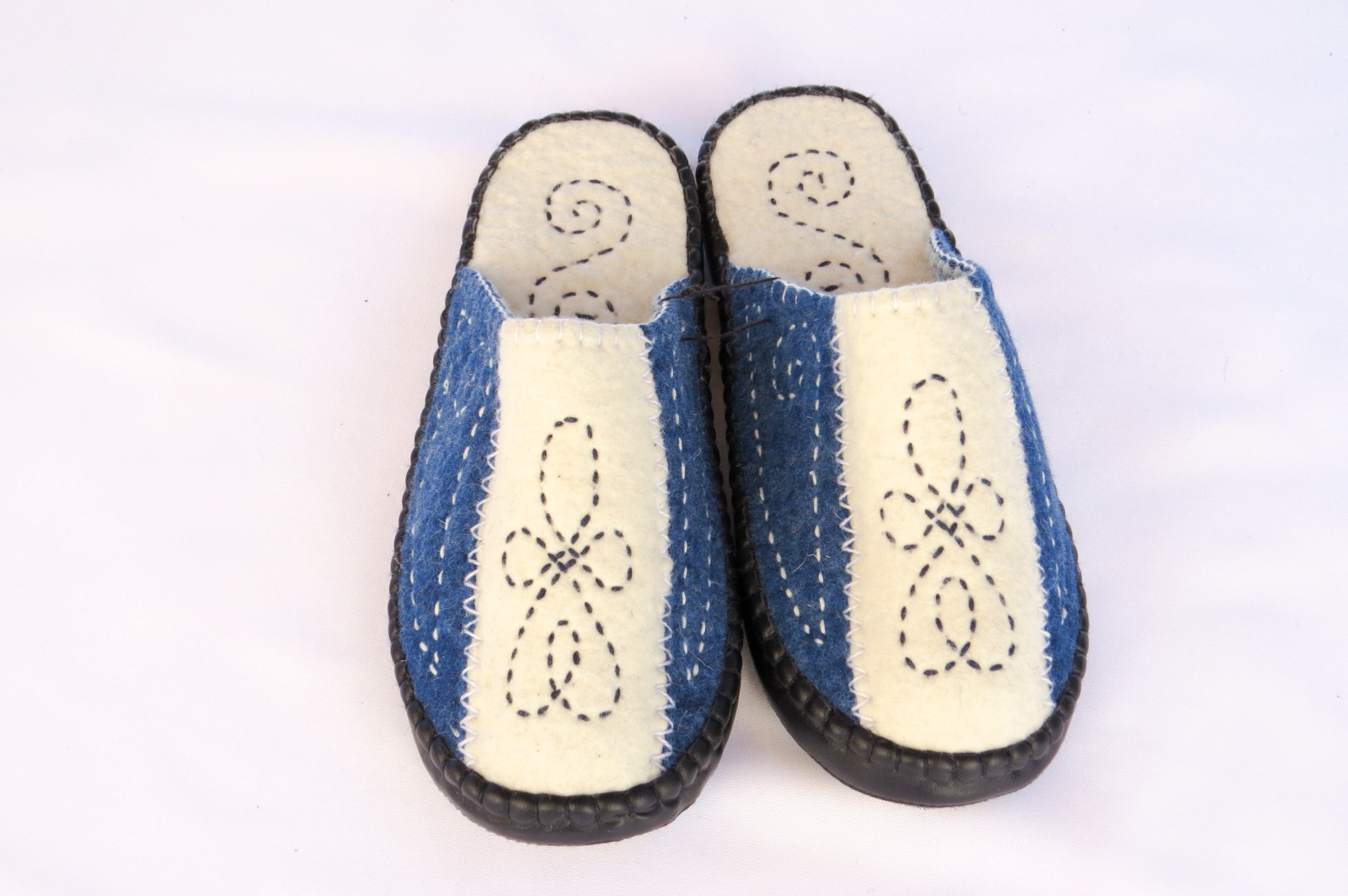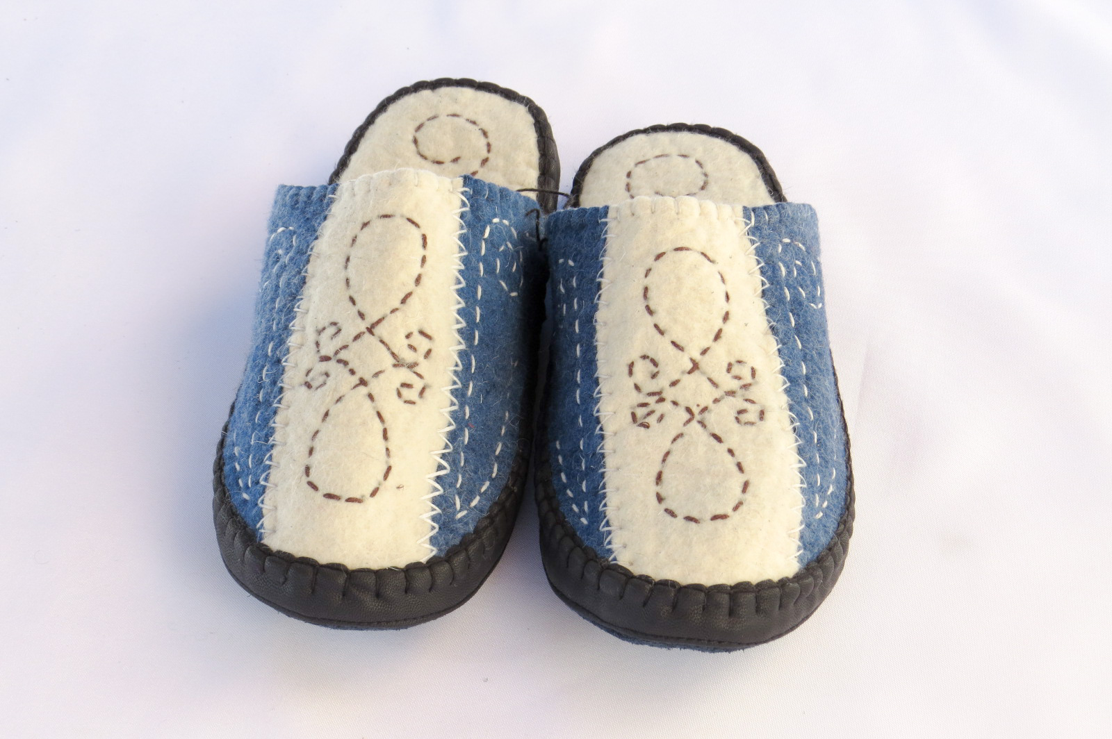 Celui ci s’obtient en mouillant et en pressant la laine de mouton afin d’obtenir une matière agglomérée. Une semelle en synthétique est cousue afin d’éviter toute glissade. Les broderies sont faites à la main.
